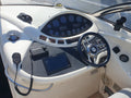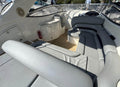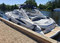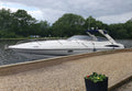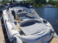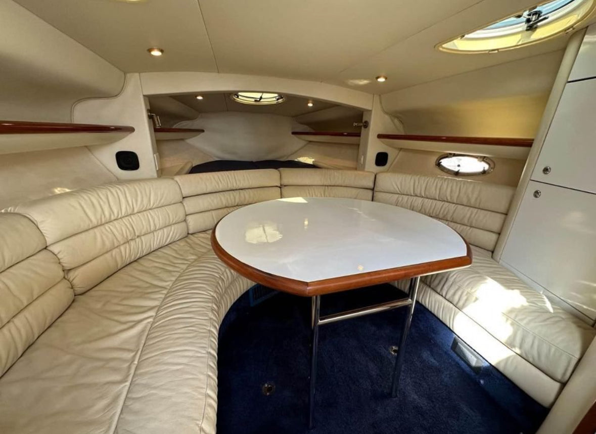 The Superhawk 34’s sleek, aggressive profile is matched by a well-designed cockpit, featuring a large sunpad, wraparound seating, and a wet bar—ideal for entertaining. Below deck, the cabin is finished in high-gloss wood and neutral upholstery, offering a convertible dinette, compact galley, and separate heads compartment, making overnight stays comfortable and practical.