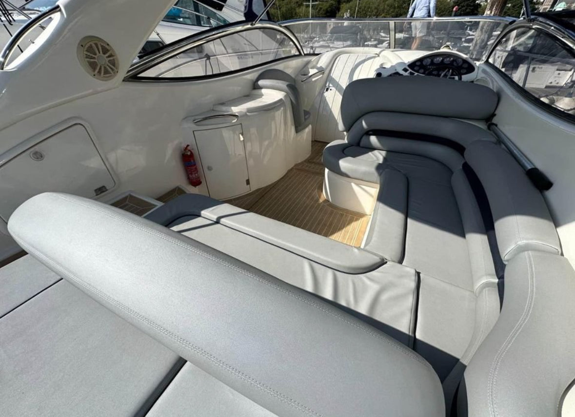 Storage lockers and under-seat compartments throughout the cabin ensure practical use of space for cruising essentials.